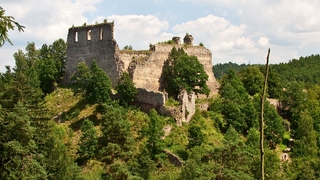Divci Kamen Castle is a monumental romantic castle ruins Girls stone can be found on high cliff in the beautiful countryside Kremzsky potok and the river Vltava River between the cities of Ceske Bude...